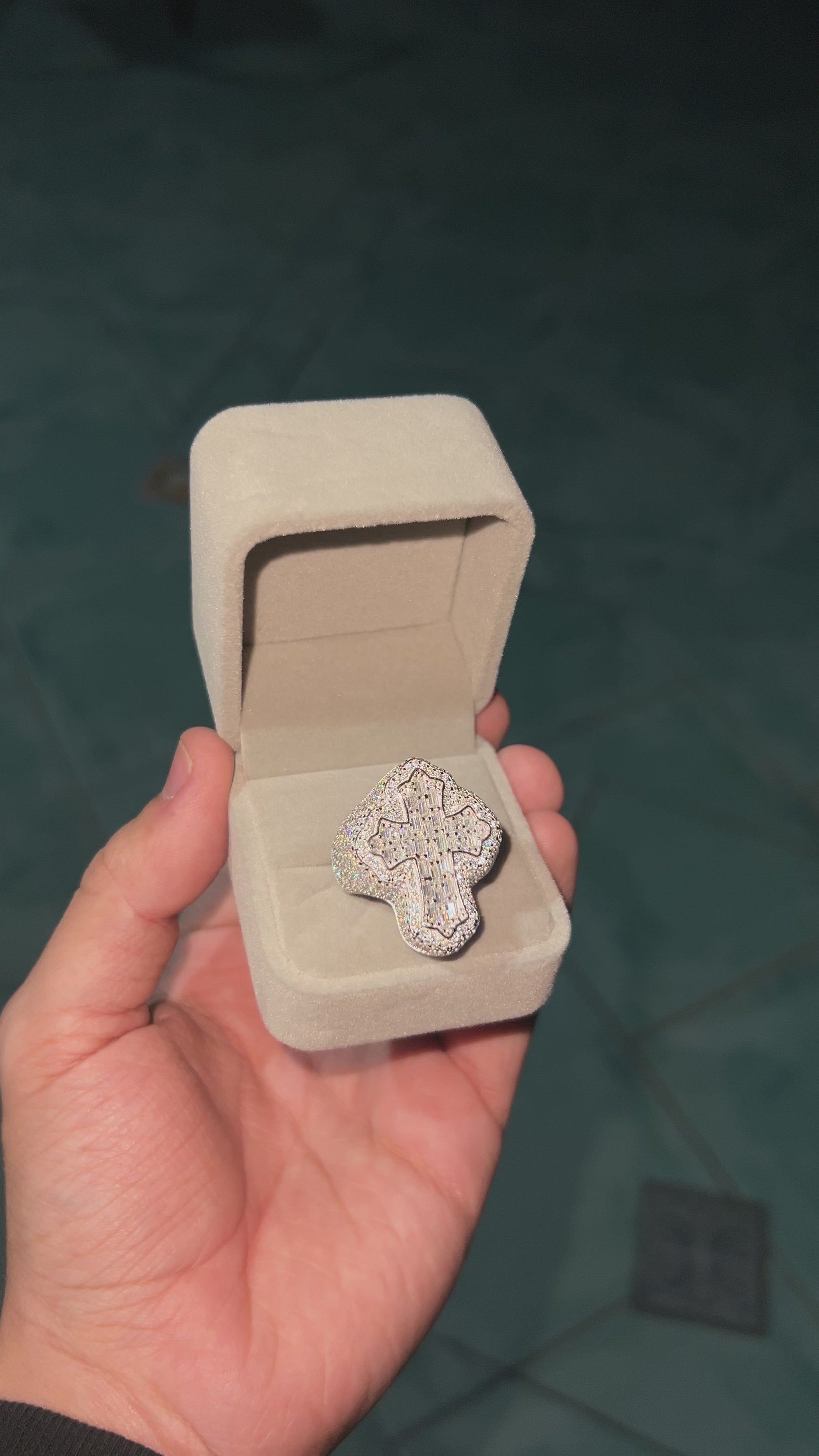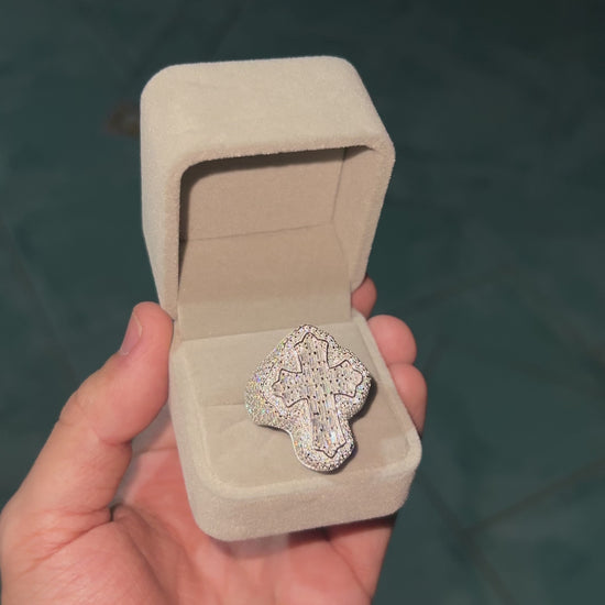Este anillo de plata está diseñado para destacar y captar todas las miradas. Su imponente diseño con una cruz grande en relieve lo convierte en una pieza audaz y cargada de simbolismo. Incrustado con moissanita VVS de alta calidad.